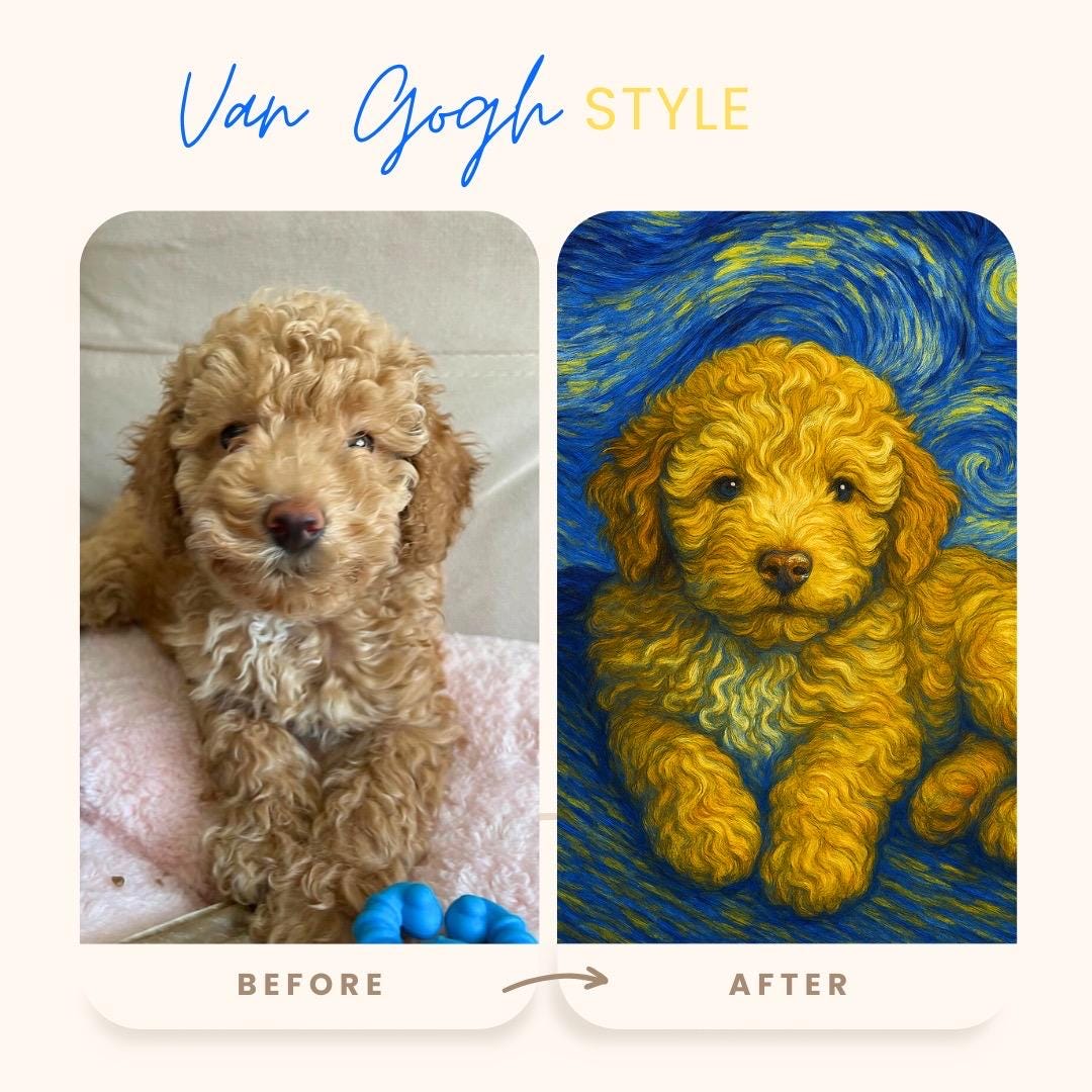 Each portrait is digitally hand-crafted from your dog’s photo, carefully capturing their unique personality, warmth, and charm — all reimagined in a timeless fine-art style. 🐶 Perfect for dog lovers, this artwork makes a meaningful birthday gift, a heartfelt memorial keepsake, or a beautiful piece of home décor. ✨ What You’ll Receive A high-resolution digital file Ready to print at home or at your favorite print shop Ideal for frames, canvas prints, posters, or custom gifts ✨ How It Works Place your order Send me your dog’s photo Receive your custom Van Gogh–style dog portrait within 3–6 hours Celebrate your dog in a way that feels magical, emotional, and timeless. Turn their photo into a masterpiece — and let your dog shine like a star in their very own Van Gogh painting 🌌🎨