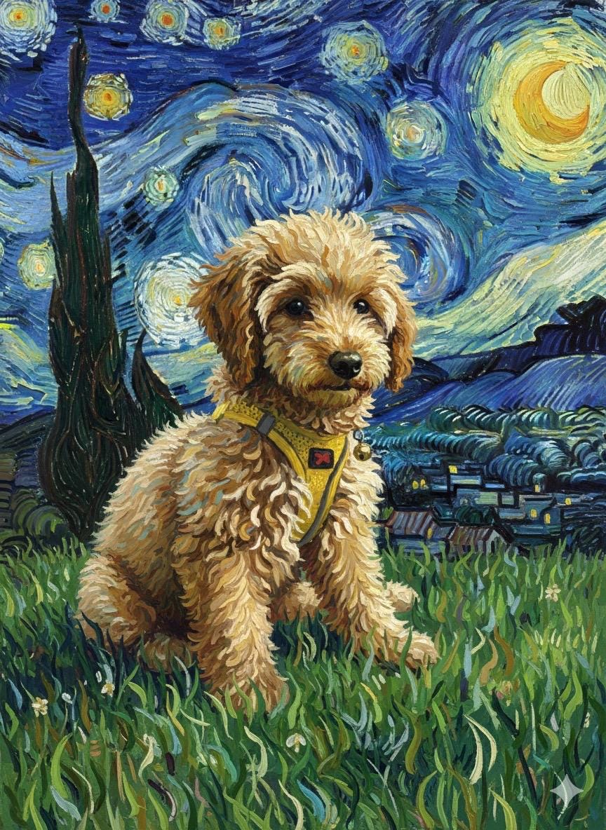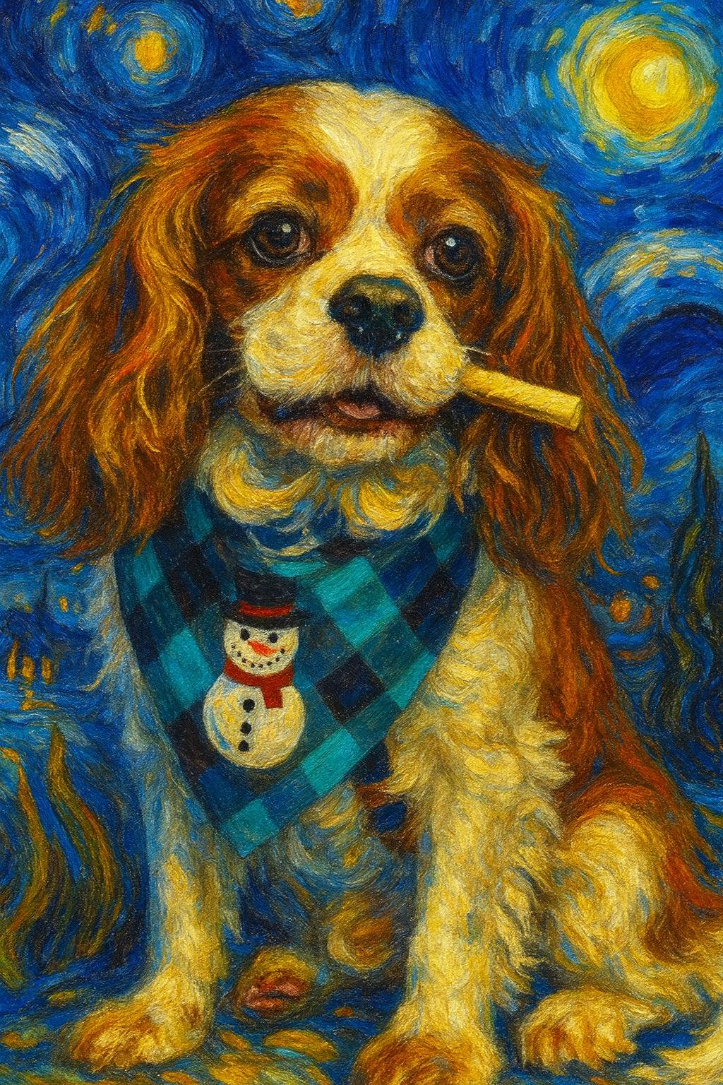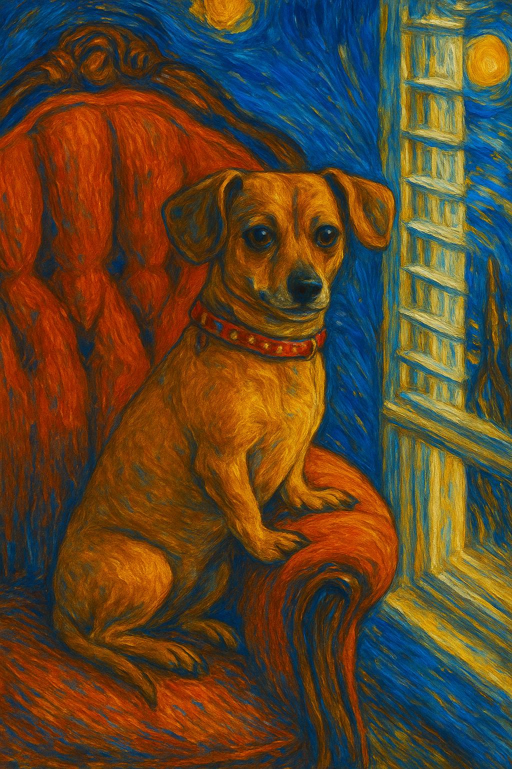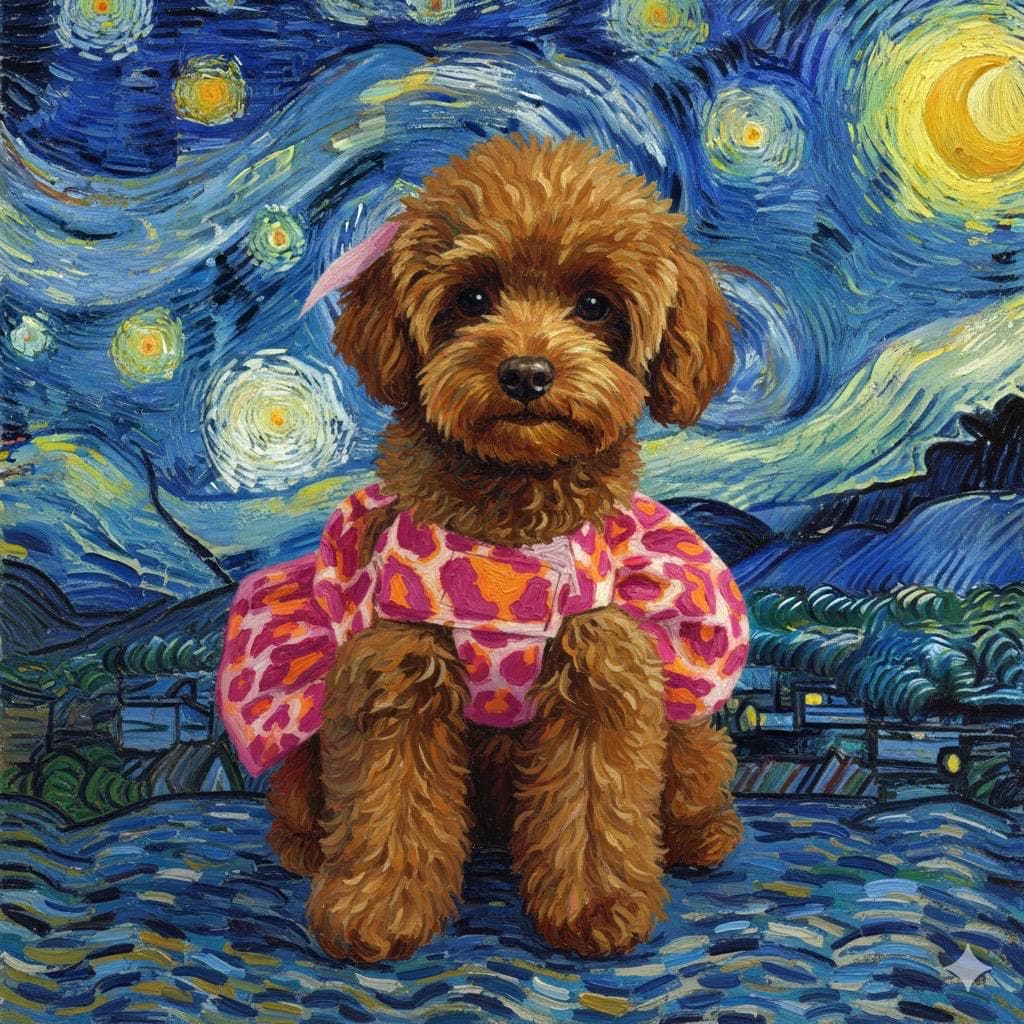 Van Gogh Style Dog Portrait – Custom Starry Night Dog Art from Photo Bring your beloved dog into the magical, swirling world of Vincent van Gogh ✨ This custom Van Gogh–style dog portrait is inspired by the iconic Starry Night, featuring bold, expressive brushstrokes, glowing highlights, and rich textures that turn your furry companion into a true work of art.