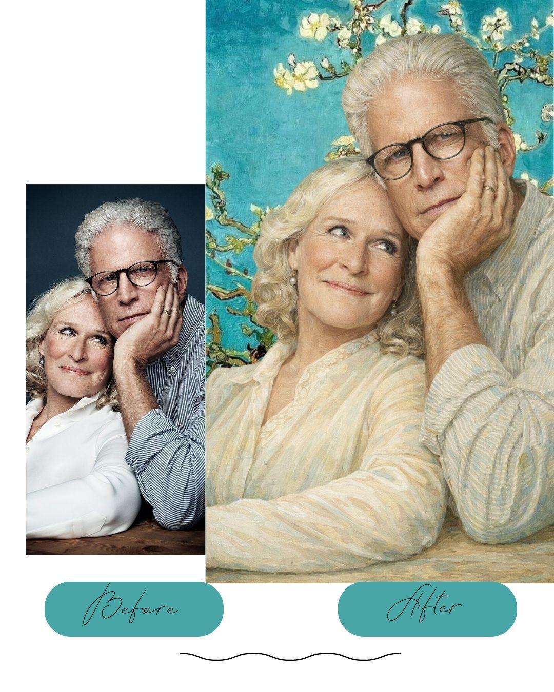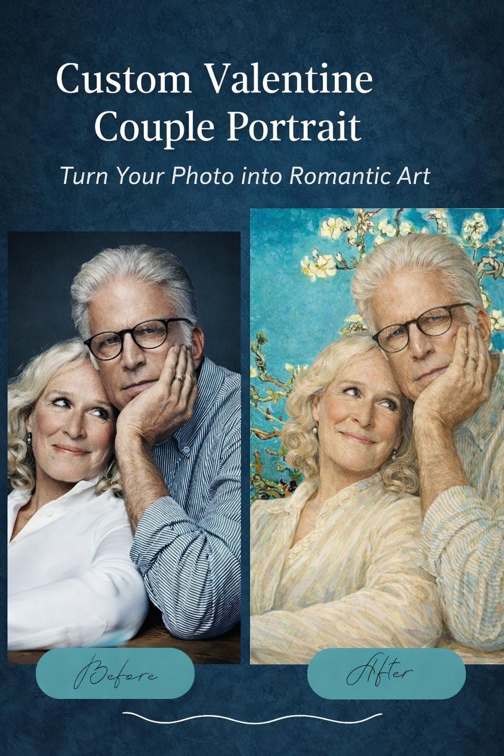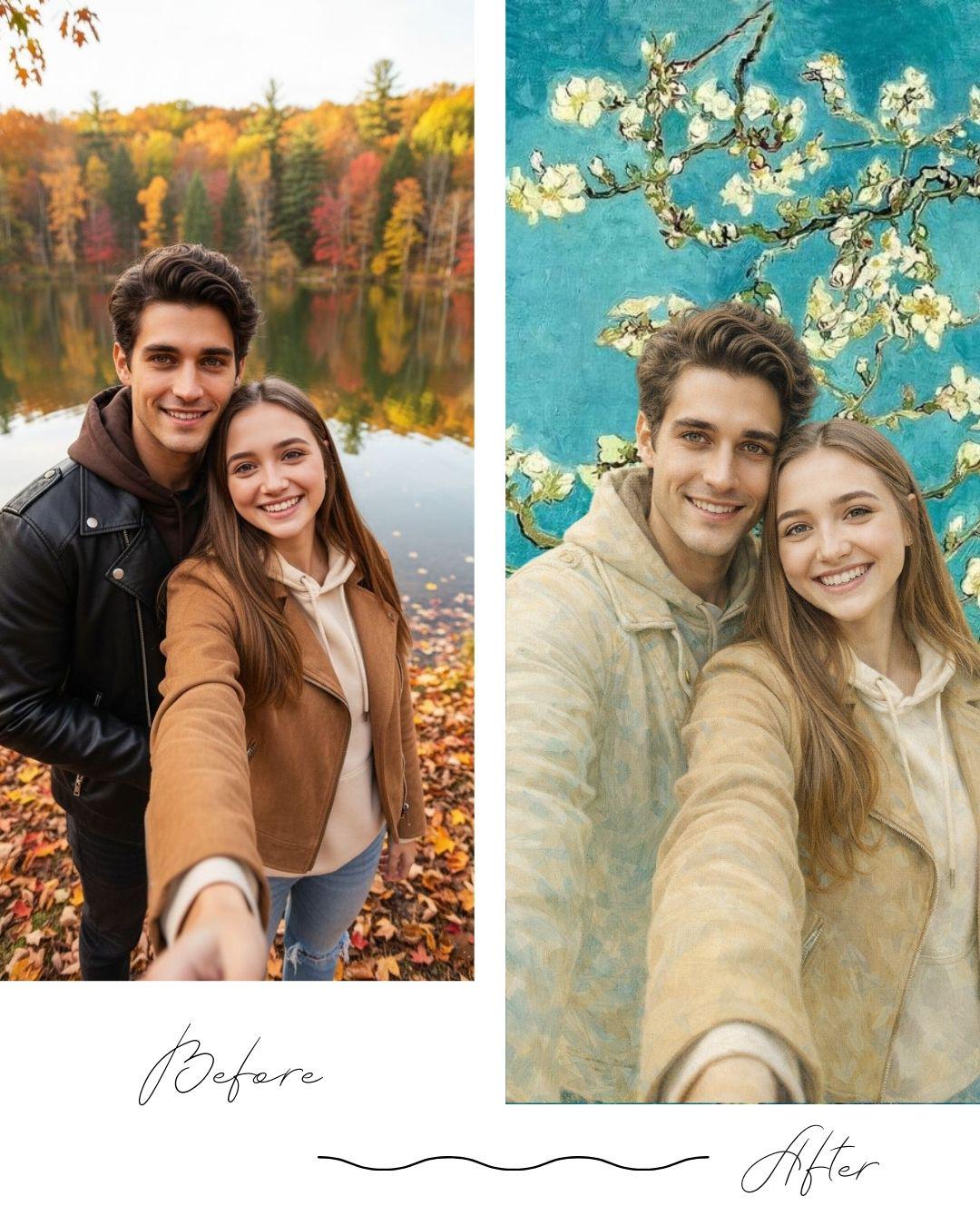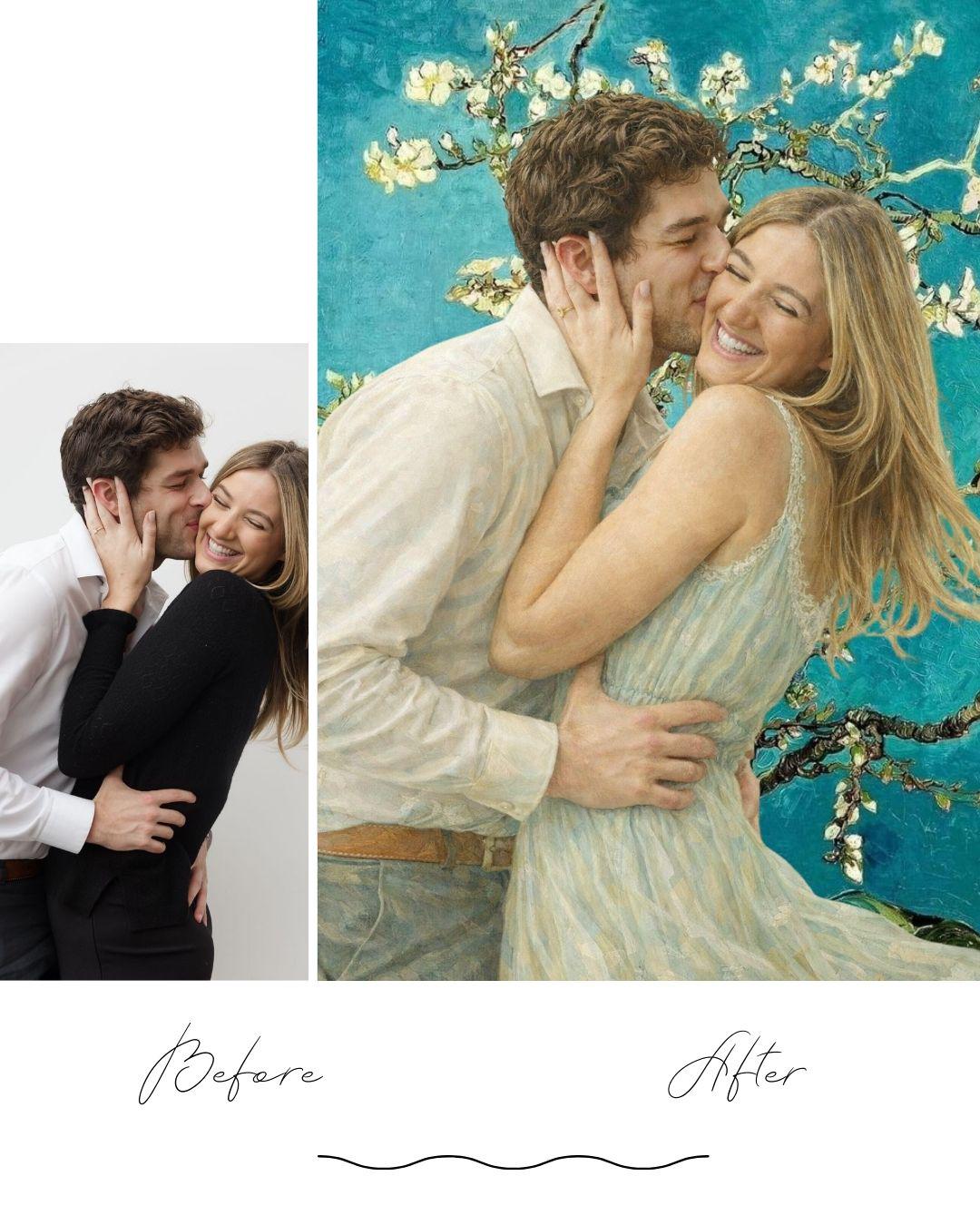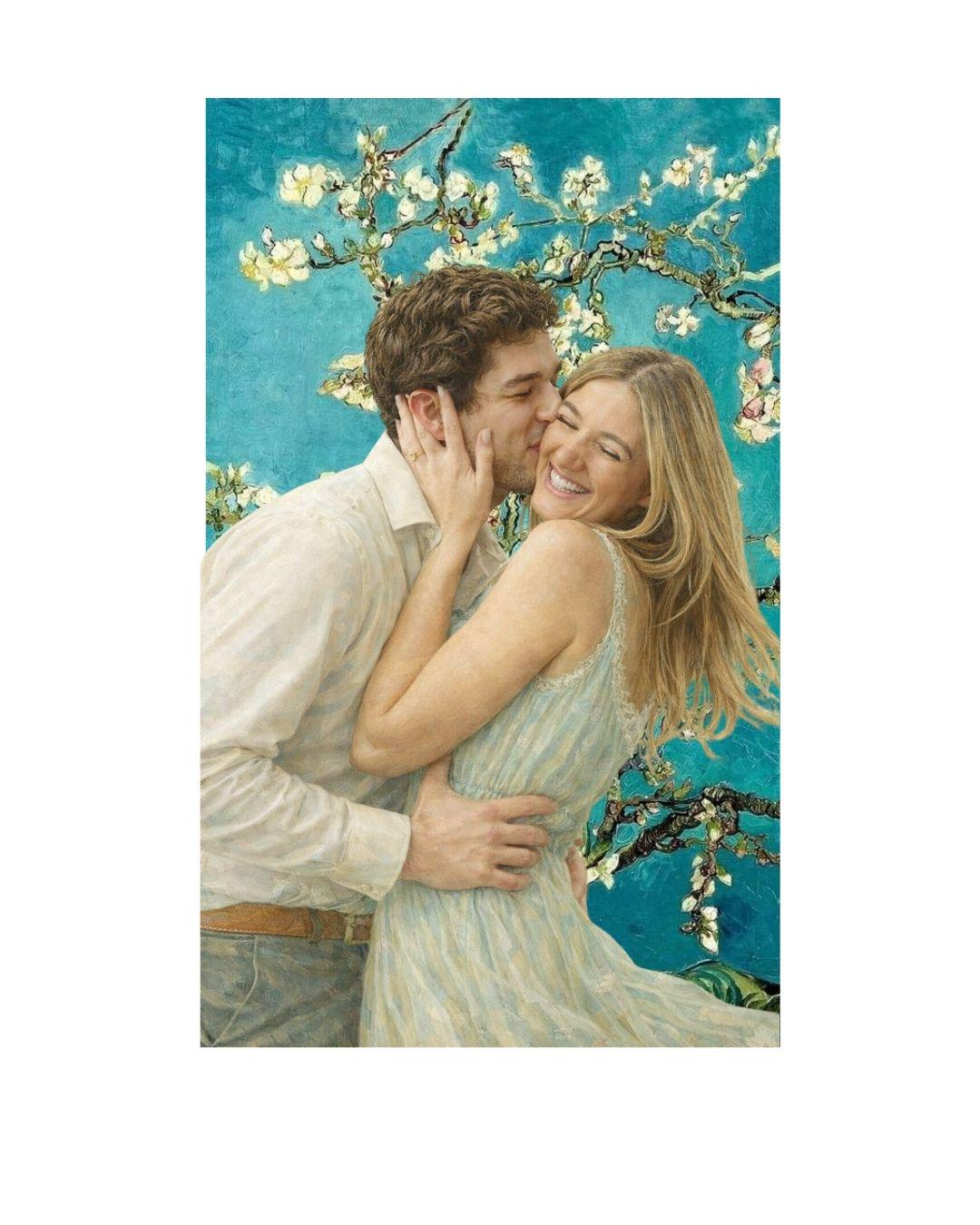 This Van Gogh–style Valentine couple portrait is inspired by the serene beauty of Almond Blossom, reimagined as a romantic and elegant Valentine’s Day gift.