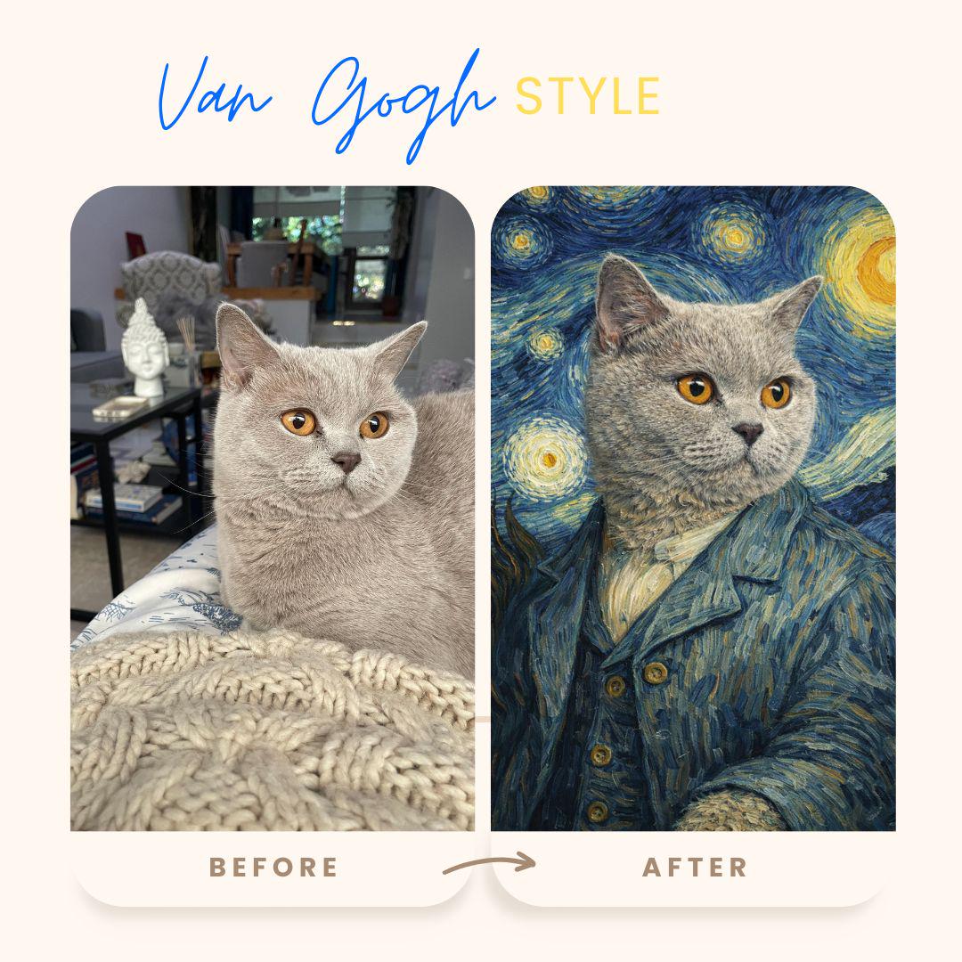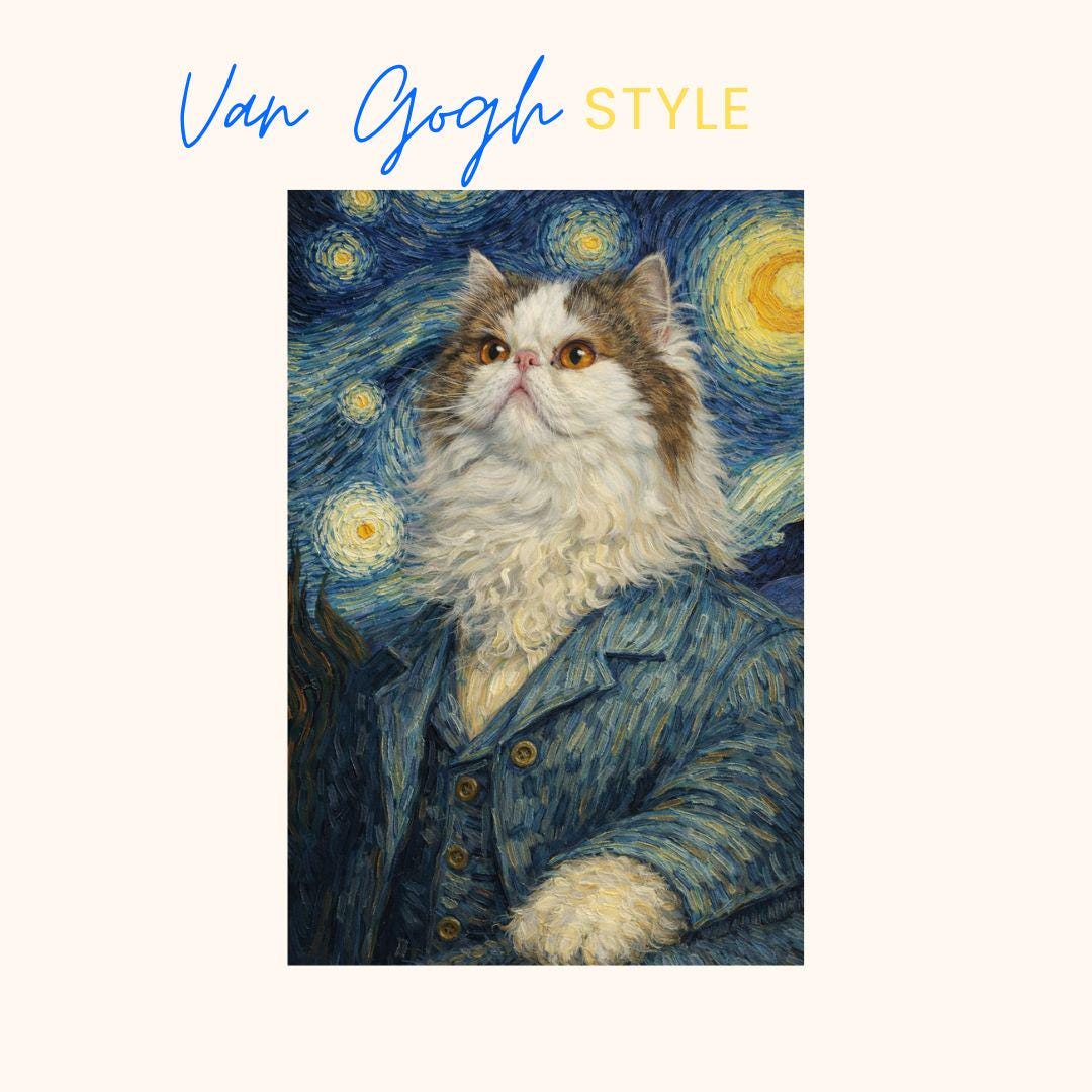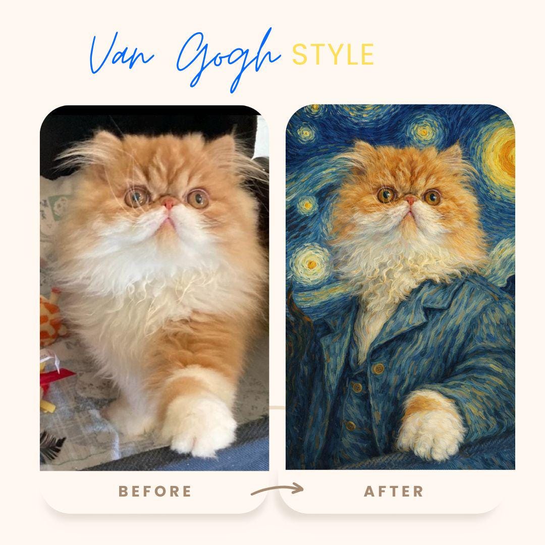 🎨 Van Gogh Style Pet Portrait – A Playful Art Tribute What if your pet stepped into the world of fine art? This Van Gogh–style pet portrait is a playful and artistic reinterpretation inspired by Vincent van Gogh’s iconic self-portrait style. Your pet’s face is carefully illustrated and placed into a painterly composition with expressive brushstrokes, rich textures, and a Starry Night–inspired background — creating a truly unique and unforgettable artwork. This piece blends humor, personality, and classic art, making it perfect for pet lovers who appreciate creativity and timeless style. This is not a filter. Each portrait is custom-created from your pet’s photo, preserving their unique expression while transforming it into a bold, art-inspired masterpiece. 🐾 Perfect For Cat or dog lovers Funny yet artistic pet portraits Unique gifts for pet parents Home décor with personality Art lovers with a sense of humor 📦 What You’ll Receive High-resolution digital artwork (JPG & PNG) Print-ready sizes included: A4 A3 11×14 16×20 Digital download only (no physical item shipped) ✨ How It Works Place your order Send me a clear photo of your pet (cat or dog) I create your custom Van Gogh–style pet portrait Receive your artwork within 2–4 days One free revision included 📸 Photo Tips For the best result, please send: A clear, high-quality photo No filters or heavy edits Good lighting and visible facial details Bring your pet into the world of classic art — a little humorous, a little bold, and completely unforgettable 🎨🐾