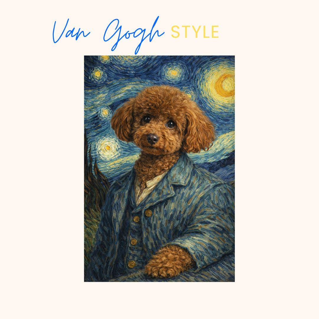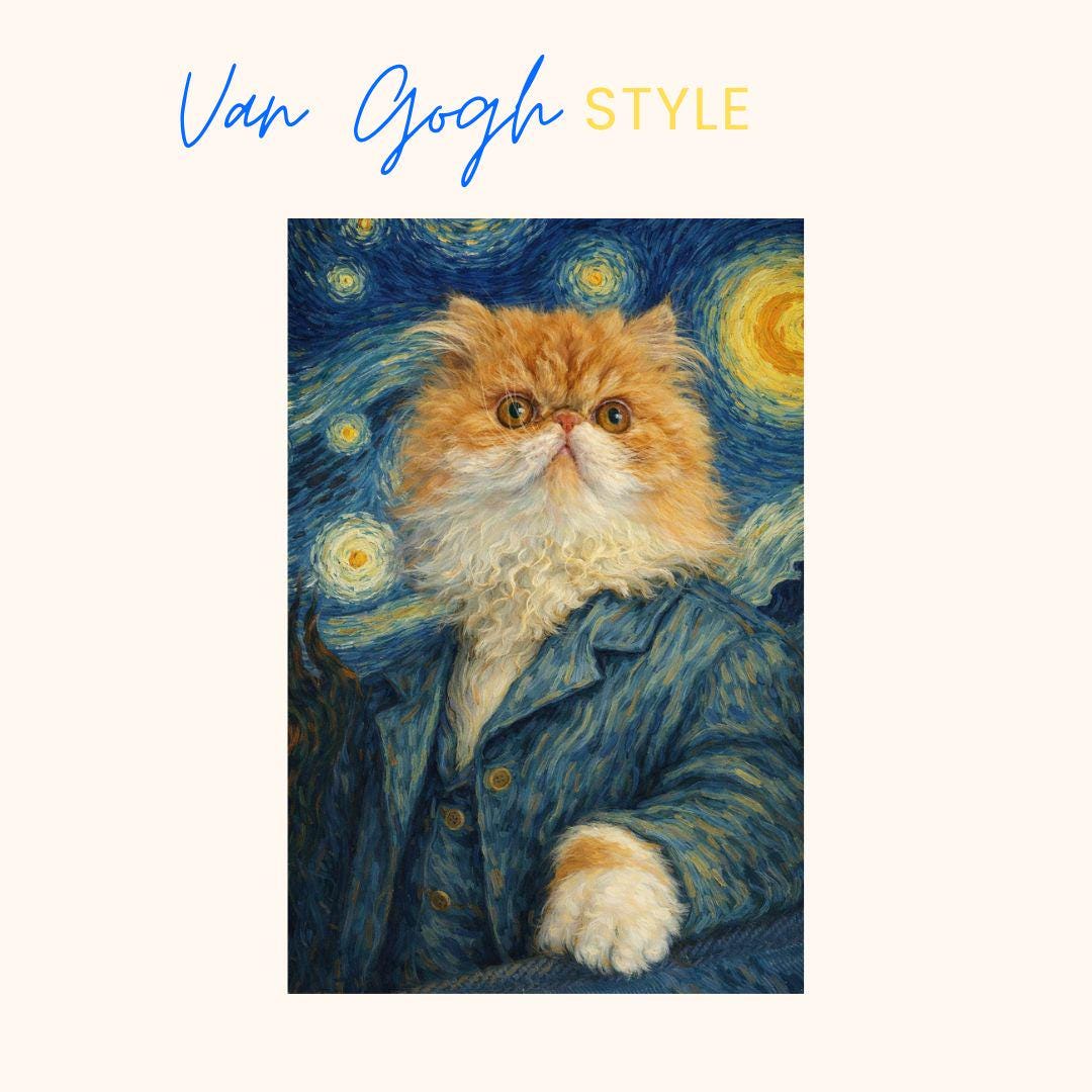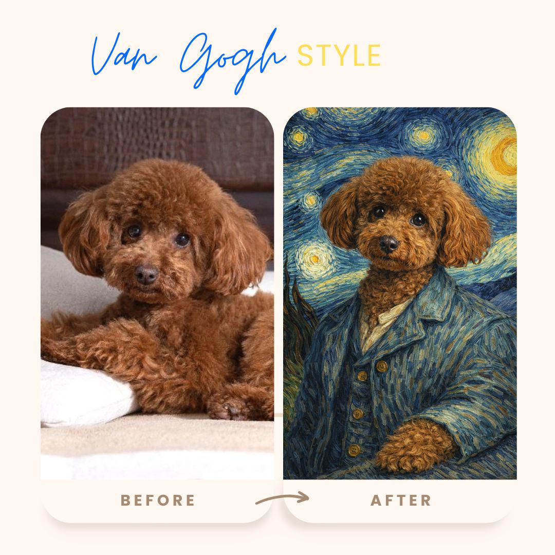 🎨 Van Gogh Style Pet Portrait – A Playful Art Tribute What if your pet stepped into the world of fine art? This Van Gogh–style pet portrait is a playful and artistic reinterpretation inspired by Vincent van Gogh’s iconic self-portrait style. Your pet’s face is carefully illustrated and placed into a painterly composition with expressive brushstrokes, rich textures, and a Starry Night–inspired background — creating a truly unique and unforgettable artwork. This piece blends humor, personality, and classic art, making it perfect for pet lovers who appreciate creativity and timeless style. This is not a filter. Each portrait is custom-created from your pet’s photo, preserving their unique expression while transforming it into a bold, art-inspired masterpiece. 🐾 Perfect For Cat or dog lovers Funny yet artistic pet portraits Unique gifts for pet parents Home décor with personality Art lovers with a sense of humor 📦 What You’ll Receive High-resolution digital artwork (JPG & PNG) Print-ready sizes included: A4 A3 11×14 16×20 Digital download only (no physical item shipped) ✨ How It Works Place your order Send me a clear photo of your pet (cat or dog) I create your custom Van Gogh–style pet portrait Receive your artwork within 2–4 days One free revision included 📸 Photo Tips For the best result, please send: A clear, high-quality photo No filters or heavy edits Good lighting and visible facial details Bring your pet into the world of classic art — a little humorous, a little bold, and completely unforgettable 🎨🐾