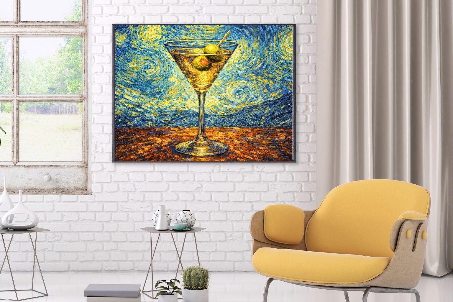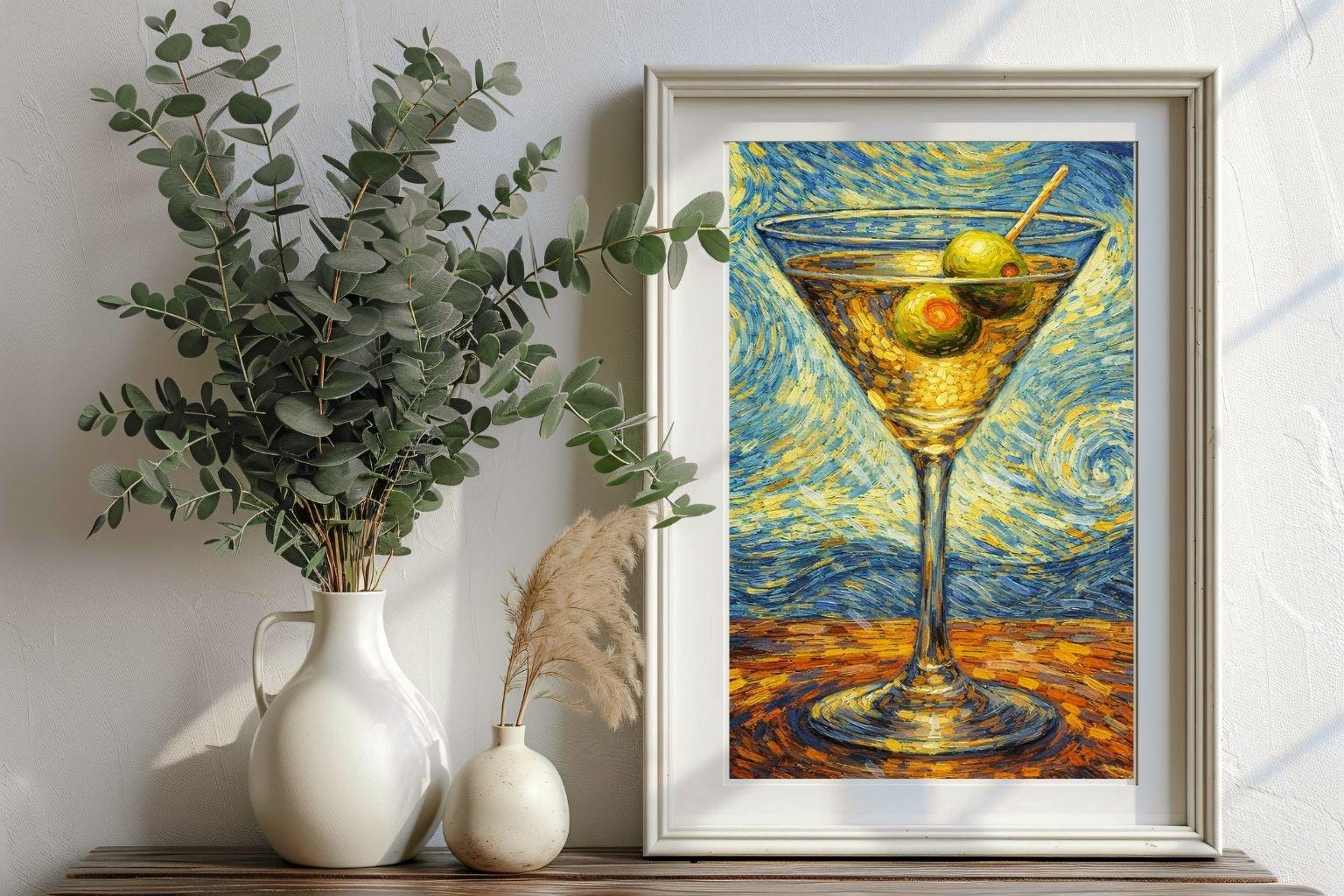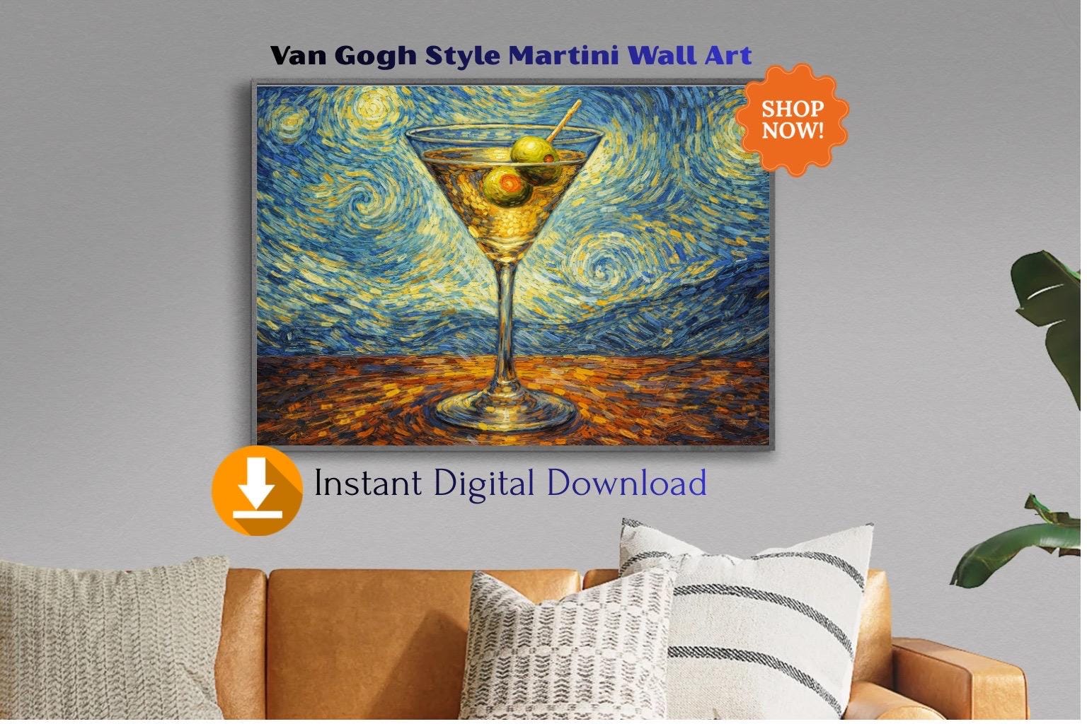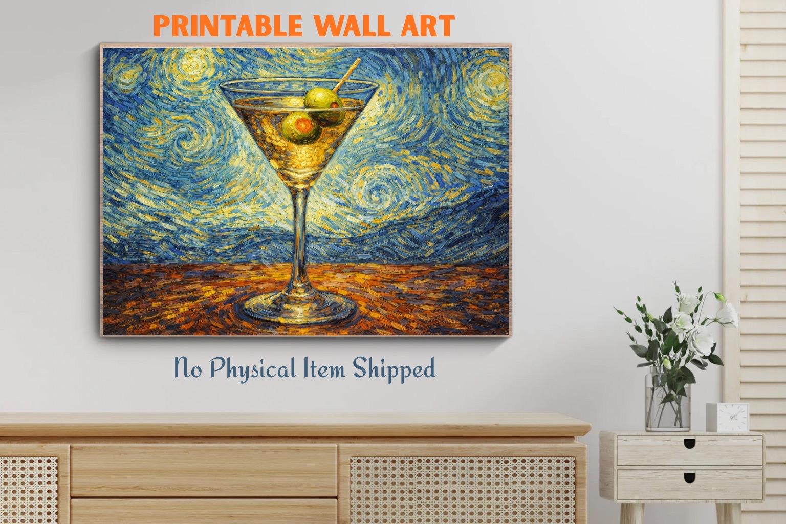 🍸 Van Gogh–Inspired Martini Wall Art This artwork blends the timeless energy of Van Gogh–style swirling brushstrokes with a modern cocktail subject, creating a bold and elegant piece of bar wall decor. Inspired by Starry Night, the vivid blues and golden tones surround a classic martini glass, making this artwork perfect for: Home bars Kitchens Dining areas Modern or eclectic interiors ✨ WHAT YOU WILL RECEIVE 1 high-resolution digital art file Museum-style painterly texture Rich swirling brushstrokes inspired by Vincent van Gogh Instant digital download 🖨️ PRINTING OPTIONS You can print this artwork: At home At a local print shop Online printing services Looks beautiful as: Poster Canvas Framed wall art 📌 PLEASE NOTE This is a DIGITAL DOWNLOAD No physical product will be shipped Frame not included Colors may vary slightly depending on screen and printer 🍸 A perfect gift for art lovers, cocktail enthusiasts, and anyone who appreciates expressive, painterly wall art.