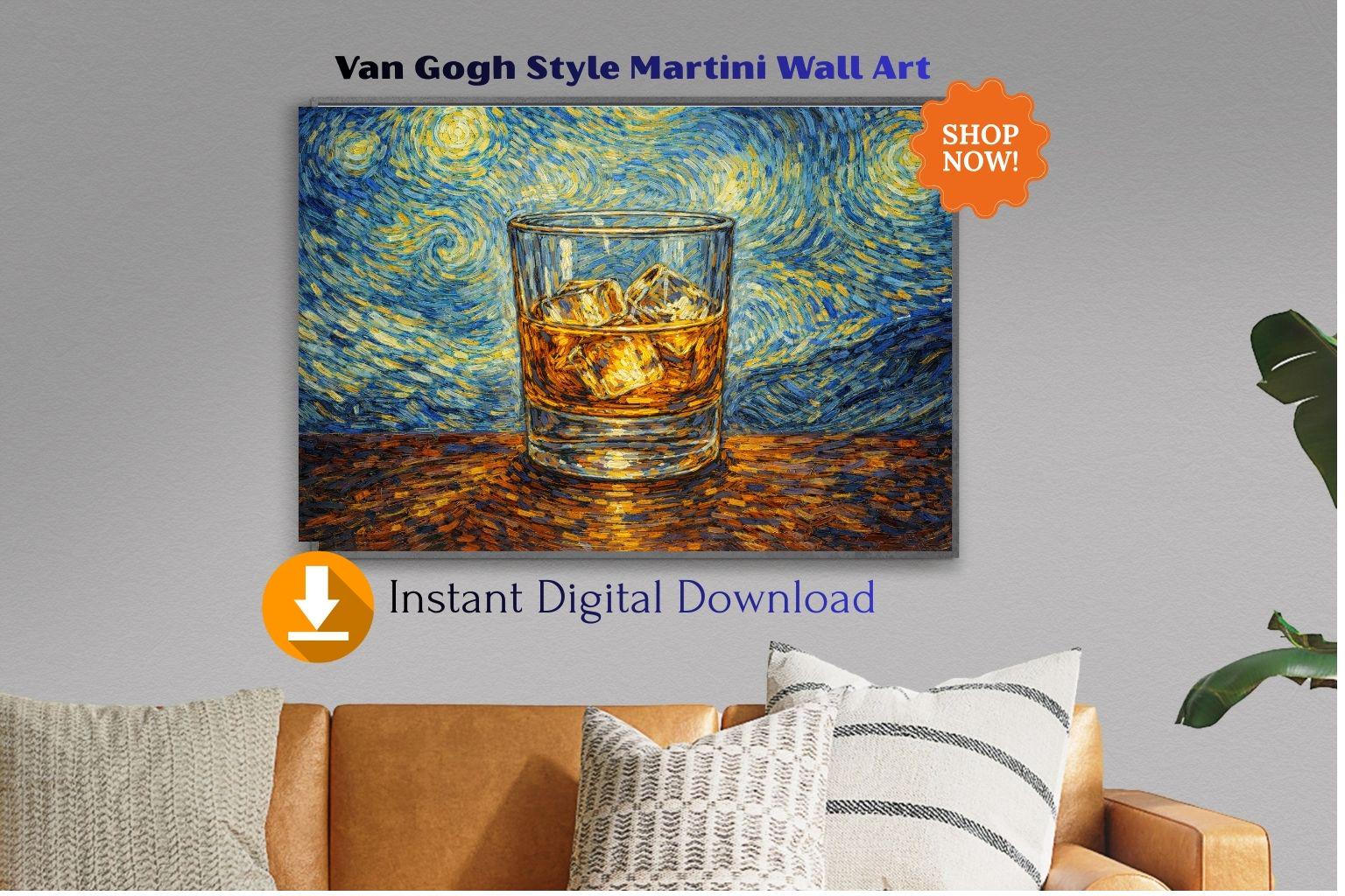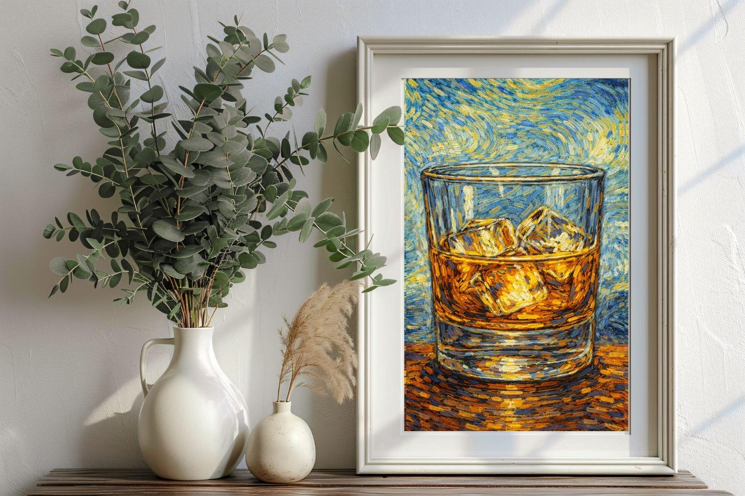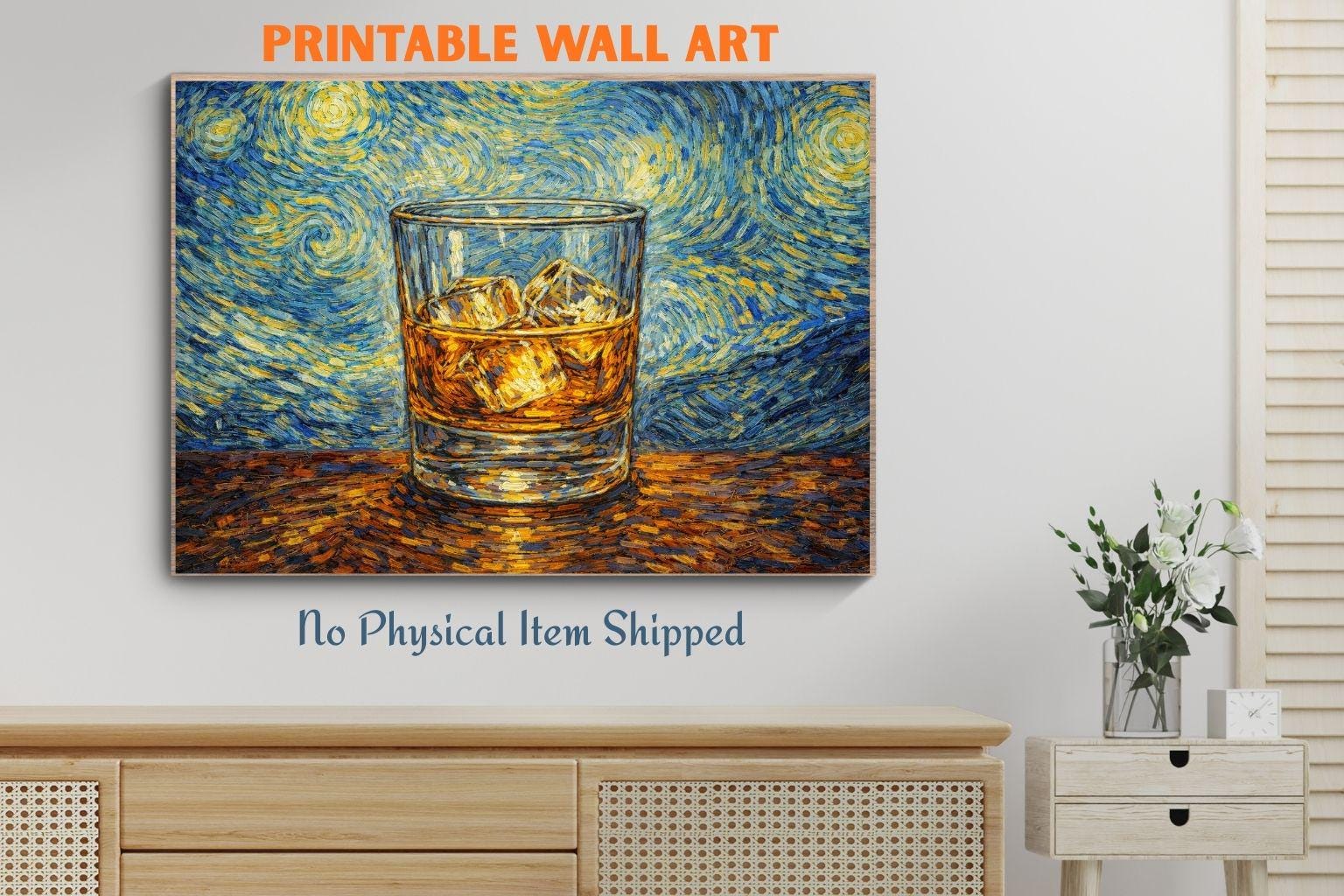 🥃 Van Gogh–Inspired Whiskey Wall Art This artwork reimagines a classic whiskey glass through bold, expressive brushstrokes inspired by Vincent van Gogh. Swirling blues and glowing amber tones evoke the movement of Starry Night, blending fine art with modern bar decor. Perfect for: Home bars Offices Living rooms Whiskey lovers & art collectors ✨ WHAT YOU WILL RECEIVE 1 high-resolution digital artwork Van Gogh–style swirling brushstrokes Rich amber & deep blue color palette Instant digital download Museum-style painterly texture 🖨️ PRINTING OPTIONS You can print this artwork: At home At a local print shop Via online printing services Looks stunning as: Poster Canvas print Framed wall art 📌 PLEASE NOTE This is a DIGITAL PRODUCT No physical item will be shipped Frame not included Colors may vary slightly due to monitor and printer settings 🥃 A striking gift for whiskey lovers, men’s home decor, and anyone who appreciates expressive, painterly art with character.
